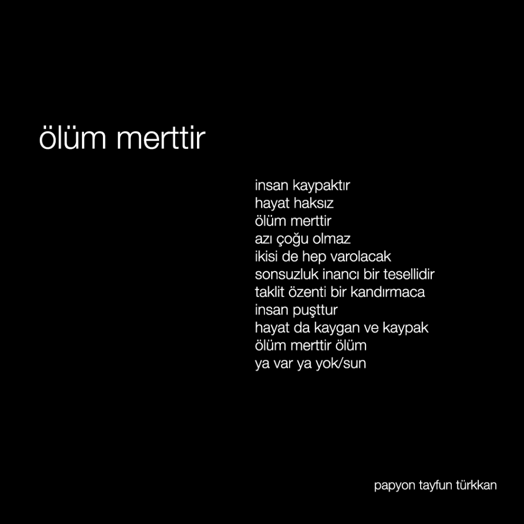 insan kaypaktır hayat haksız ölüm merttir azı çoğu olmaz ikisi de hep varolacak sonsuzluk inancı bir tesellidir taklit özenti bir kandırmaca insan puşttur hayat da kaygan ve kaypak ölüm merttir ölüm ya var ya yok/sun